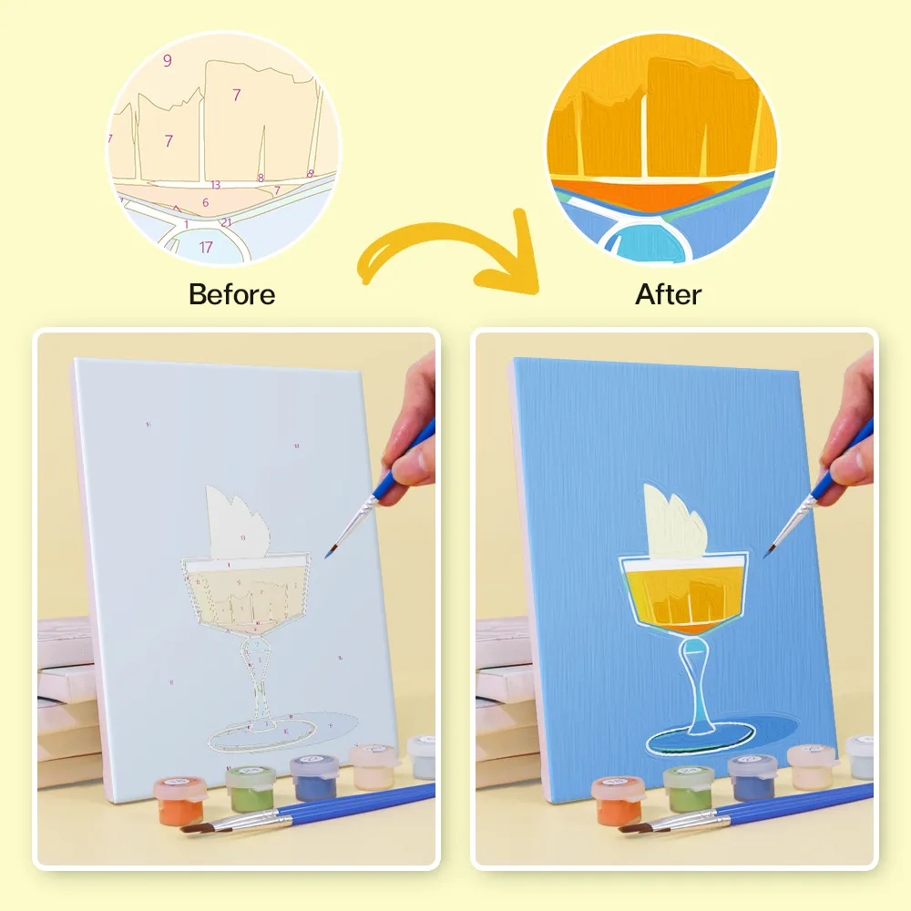 Das Mini-Malen-nach-Zahlen-Set „Bunte sprudelnde Getränke“ bringt prickelnde Erfrischung auf die Leinwand. Ob mit Zitrusfrüchten, Eiswürfeln oder bunten Strohhalmen – dieses Motiv versprüht Lebensfreude, Leichtigkeit und Sommerlaune.