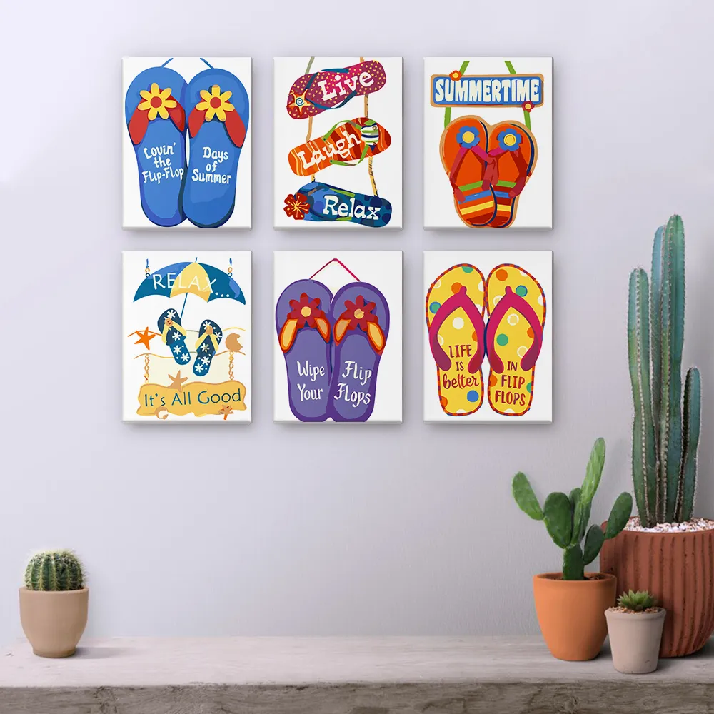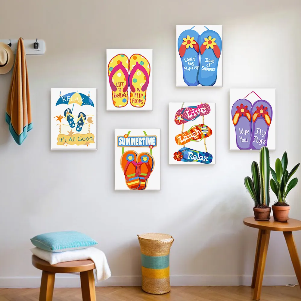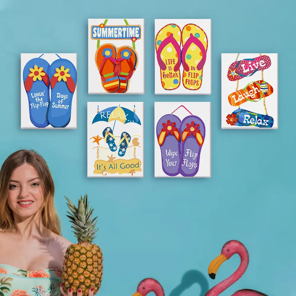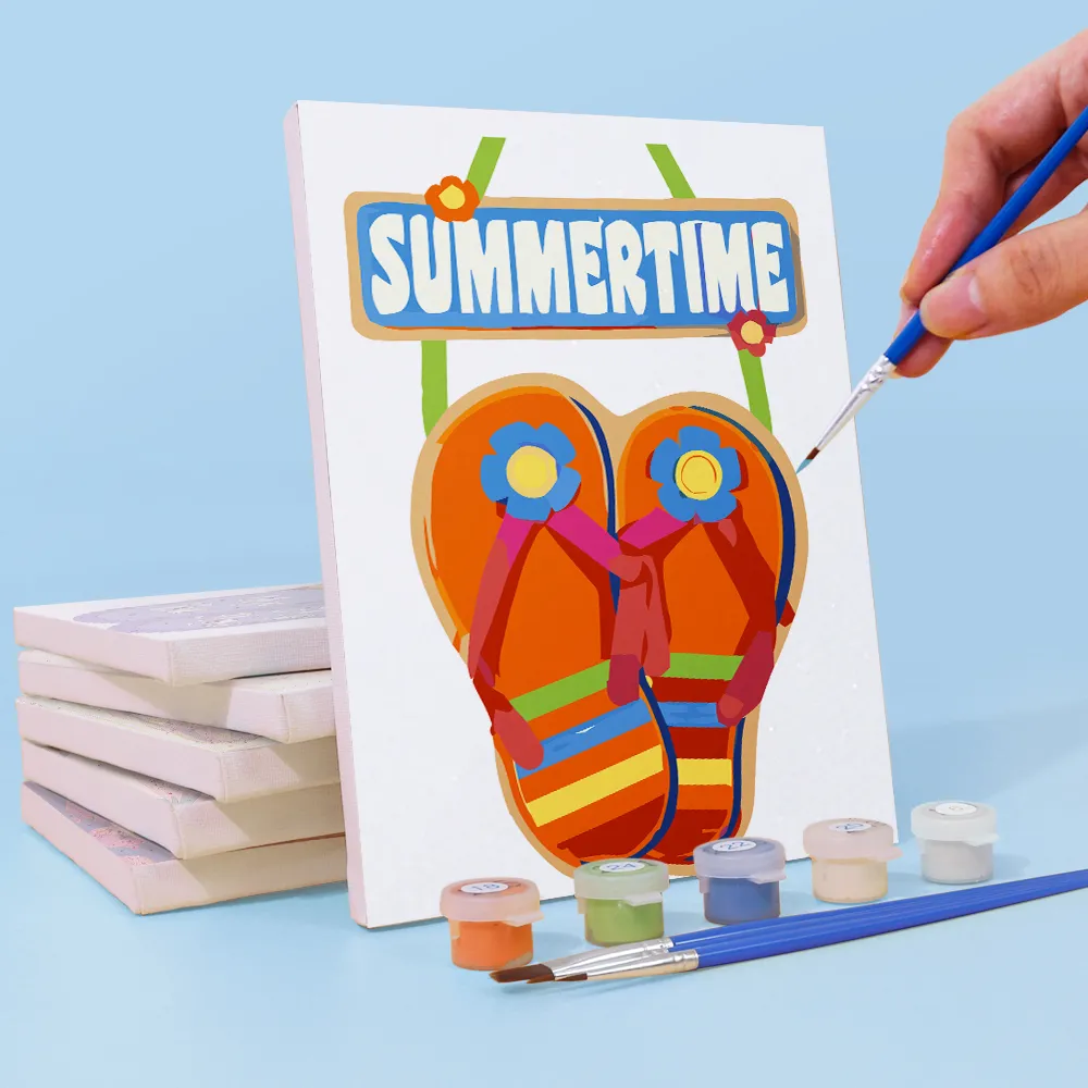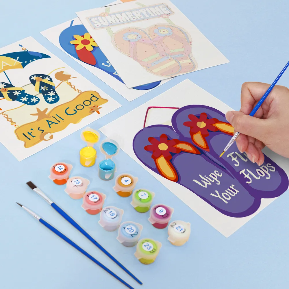 The “Summery Flip-Flops” Mini Paint by Numbers set brings sunny beach moments directly to your canvas. Colorful flip-flops in the sand, accompanied by shells or ocean waves, exude a real vacation atmosphere and summer joy. The compact set is ideal for creative breaks, small gifts, or as a DIY reminder of your last beach vacation. The pre-printed mini canvas, the bright acrylic paints, and the fine brush make painting easy and relaxing – perfect for beginners.